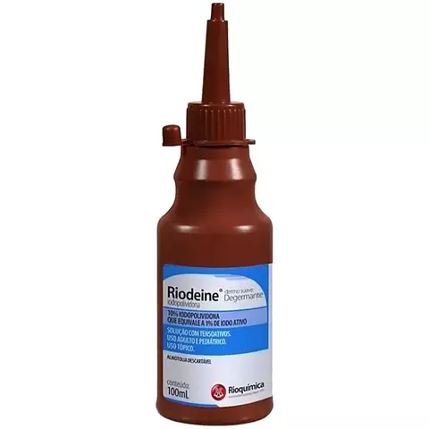 - Ativo contra todas as formas de bactérias não esporuladas, fungos e vírus.Especificações:- Conteúdo: 01 PVPI 10% Riodeine Rioquímica Solução Aquosa Dermo Suave Degermante Almotolia 100ml- Cada 100ml da solução contém iodopolividona 10g- Excipientes: laurel éter de sódio, glicerina, ácido cítrico, fosfato trissódico e água purificadaRegistro M.S: Med. de Notif. Simp. RDC Anvisa no 199/2006. AFE N° 1.01.520-1.Vendido por unidadeAs cores apresentadas no site são meramente ilustrativas e podem ou não corresponder com exatidão à tonalidade aplicada.Para mais informações sobre manuseio e cuidados quanto ao uso do produto, consulte o Manual do Usuário.Imagem meramente ilustrativa e a descrição do produto é de responsabilidade do fabricante.
