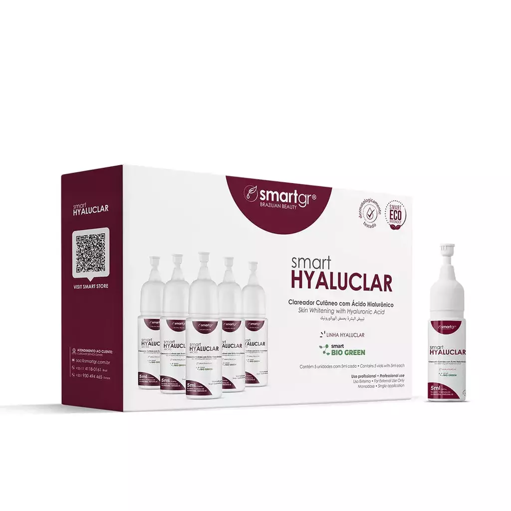 O SMART HYALUCLAR - SMART GR é um fluido facial e corporal clareador de marcas desenvolvido para uniformizar o tom da pele, reduzir linhas e rugas, e melhorar a textura e luminosidade. Sua fórmula avançada proporciona uma pele mais saudável, revitalizada e luminosa, com efeito suavizante e hidratante.